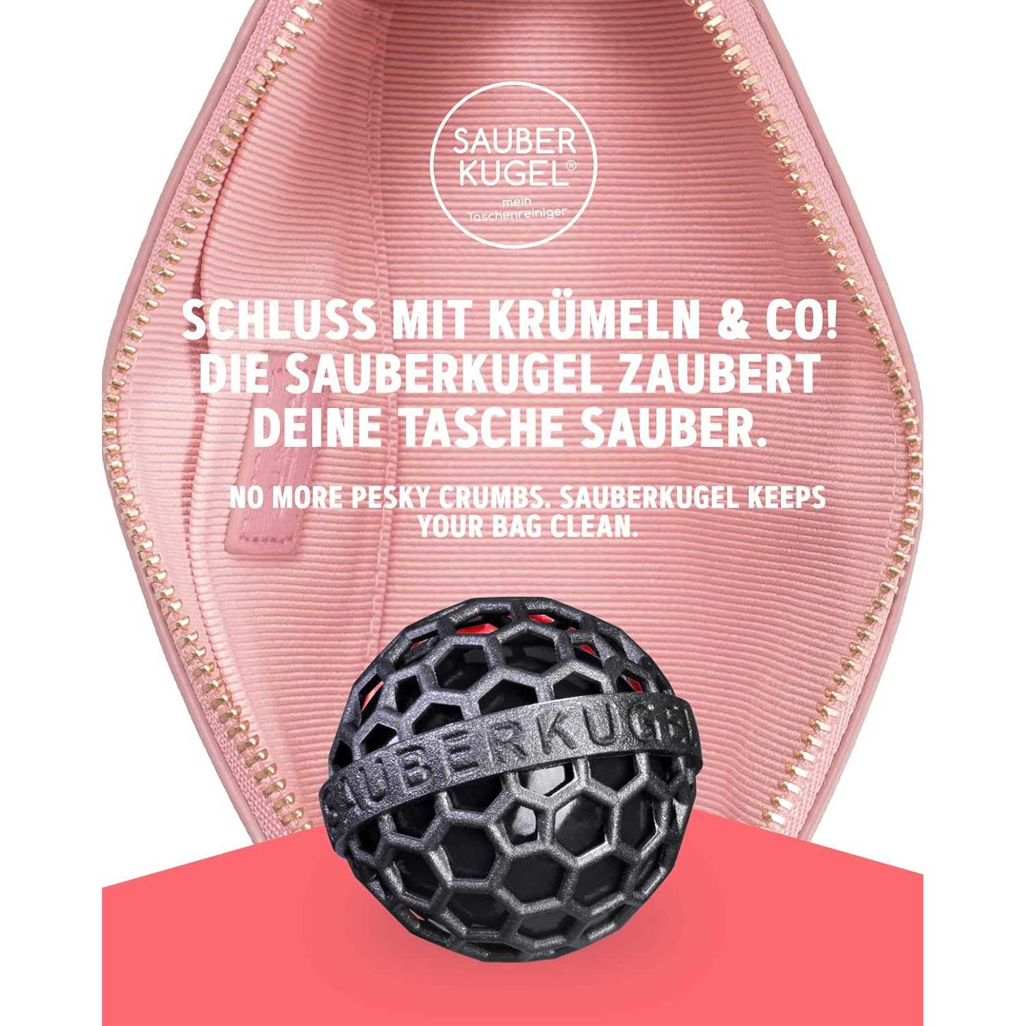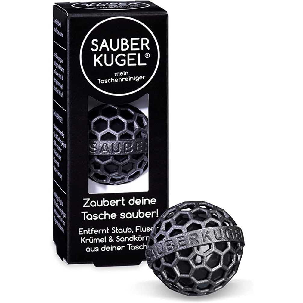 This new and innovative purse cleaner removes dust, fluff, crimbs, and more from your bag! Keeping your bag clean has never been so easy! Simply put the Sauber Kugel in your bag and that’s it! The sauber kugel has an inner sticky ball that picks up all the dirt in your bag as you move around and rummage through your bag everyday. To clean the Sauber Kugel, simply remove the durable outter layer and run the inner sticky ball under some water with a small amount of dish cleaning liquid. Made with love in Germany, the Sauber Kugel is PVC-free and does not contain any plasticisers or toxic ingredients. The Sauber Kugel is also reusable up to 10,000 times, 100% recycable, and has a 10 year guarantee. Ideal for any purse, makeup pouch, or luggage.