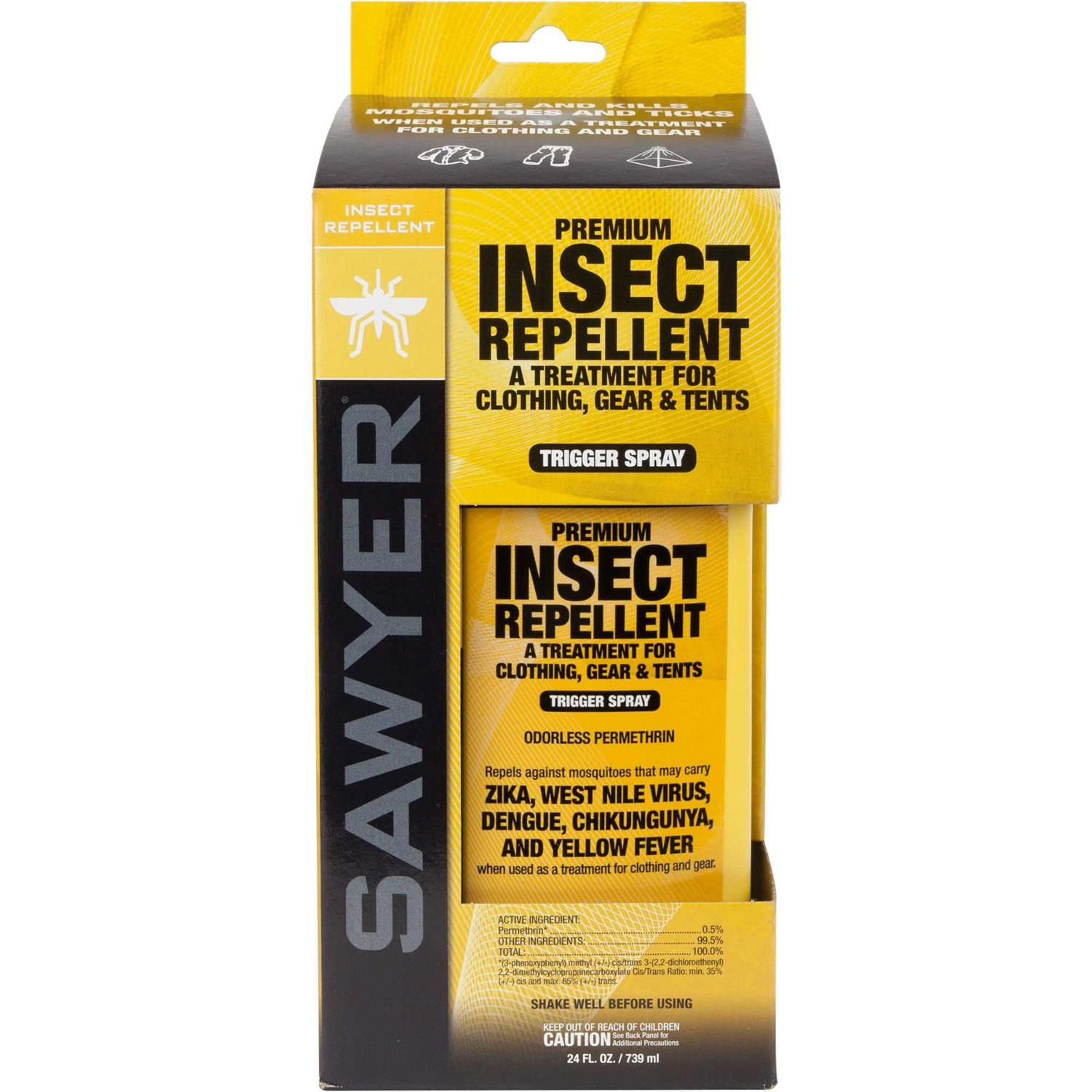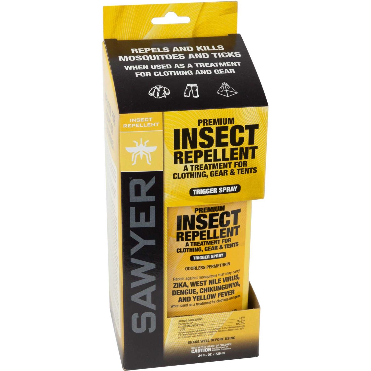 Sawyer Permethrin actually kills ticks, mosquitoes, spiders, chiggers, mites, and more than 55 other kinds of insects. Permethrin is also effective against the Yellow Fever Mosquito, which can transmit the Zika Virus. For use on clothing, tents, sleeping bags, and other outdoor gear. Providing a fantastic odorless barrier of protection, a single application of Permethrin lasts for 6 weeks or 6 washings. Using it on outdoor gear also helps reduce the mosquito population in your camp and prevents ticks from attaching to you.