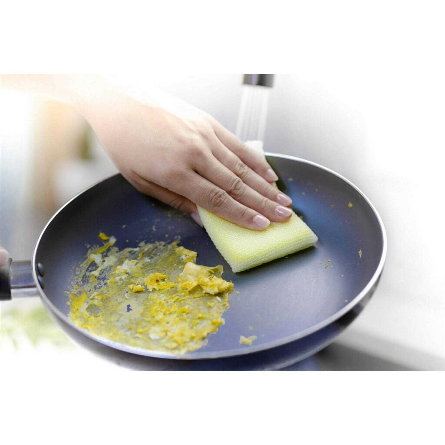All-purpose cleaning pad scours without scratching so it’s safe for Silverstone and Teflon-coated cookware. Use in kitchens, bathrooms and automobiles and on carpets, clothing and hands. Design makes it easy to hold for nonscratch cleaning. The yellow polyurethane core of the Dobie helps your soap lather while supporting the mesh. The main point of difference in this yellow-urethane cleaning tool is the unique combination of slit film and fiber interwoven into mesh that “grabs” food and dirt and pulls it away.
