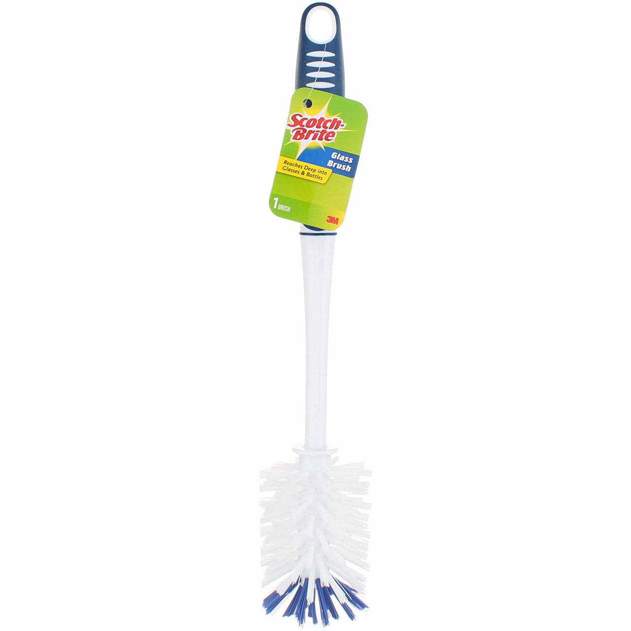 Scotch-Brite glass brush has a long handle and the long lasting bottle brush bristles easily reach the bottom of most glassware. Keep your hands out of the mess. Soft comfort grip. 9.45 In. handle length. 4.75 In. rubber grip. Bristle dimensions: 1 In. H. x 3.25 In. L. x 2.5 In. Dia. Hang hole Bristle Material Polypropylene Length 13 In. Package Type Hang Tag Pkg Qty 1