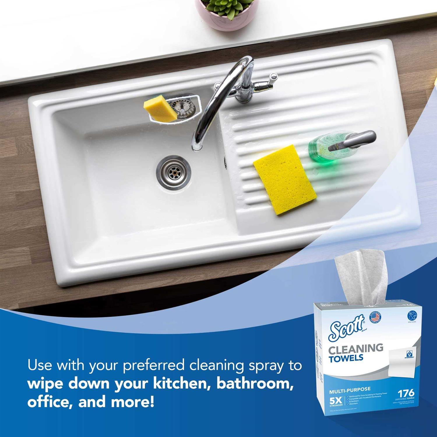 Case contains 10 boxes of 176 absorbent Scott Cleaning Towels, 1,760 towels total 2x stronger* than the leading value brand paper towel *when wet Durable; Reinforced for extra scrubbing & cleaning power Compatible with household cleaning solutions Large 8.34” x 12.5” sheets to tackle any job