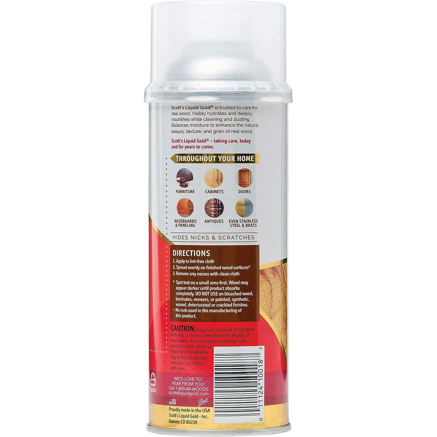 Dry air created by heating and air conditioning draws moisture out of wood. Unless the moisture is replaced warping cracking shrinking and general loss of color will result.š Scott’s Pourable Liquid Gold Wood Cleaner & Preservative penetrates into the pores of the wood to treat wood and replace lost moisture. Time-tested organic oil formula š original almond fragrance safely cleans shines dusts restores & preserves all natural or unfinished wood. Leaves no residue build-up. Contains no wax or silicones. Unlike watered-down polishes and waxes that leave wood vulnerable to cracking warping and fading. Scott’s Liquid Gold Wood Cleaner and Preservative is a unique time tested-organic oil formula wood cleaner and treatment that contains no silicone or wax. A single application will remove light wax build ups replace lost moisture bring back wood’s natural color lessen the appearance of nicks and scratches leaving wood dust-free clean and preserved. Scott’s Liquid Gold also cleans and shines stainless steel chrome and brass.