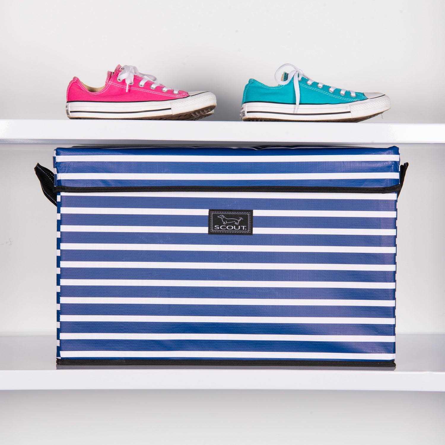 - A lidded, stackable storage bin; Excellent for dorm rooms, linen closets, foyers – you name it; Navy, White