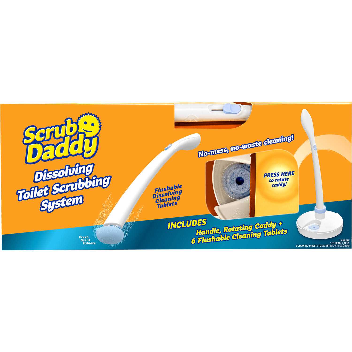 This innovative Scrub Daddy Dissolving Toilet Scrubbing System uses dissolvable tablets to quickly and efficiently clean the toilet bowl. Tablets power through tough stains and provide a fresh clean scent. Tablets are stored in the caddy base and easily click into the toilet wand when needed. The system includes 1 wand, 1 storage caddy, & 6 flushable tablets. Scrub Daddy Dissolving Toilet Scrubbing System This innovative toilet wand system uses flushable dissolvable tablets to quickly and efficiently clean the toilet bowl. Tablets power through tough stains and provide a fresh clean scent. Tablets are stored in the caddy base and easily click into the toilet wand when needed. The system includes 1 wand, 1 storage caddy, & 6 flushable tablets. Tablets last through the duration of the cleaning process and will dissolve or can be flushed when the job is done 6 tablets are included in each system and the refill packs can be purchased separately.