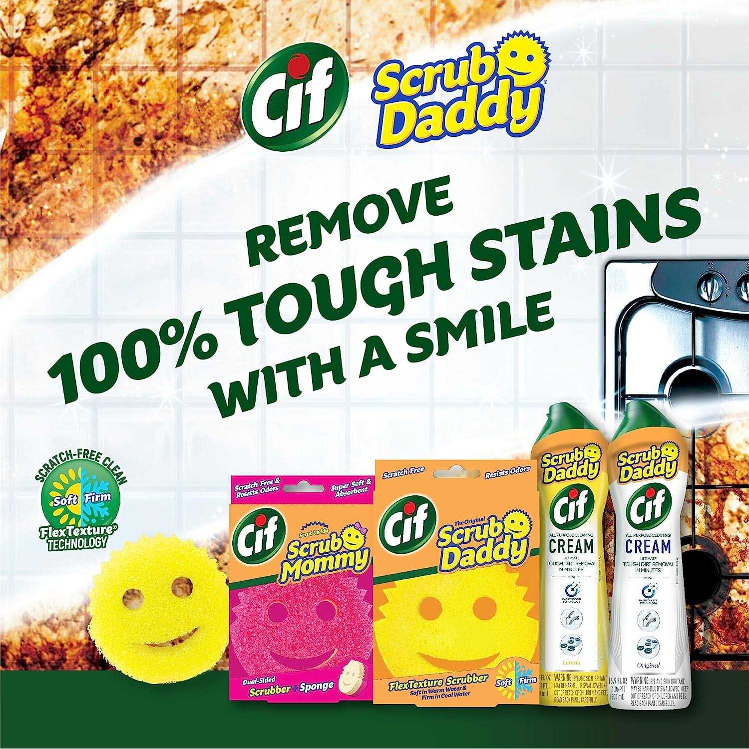 Your all-purpose cleaner just got an upgrade with Cif from Scrub Daddy. Made from natural ingredients and SmartCrystal Technology, Cif cleaning cream lifts stubborn dirt, encrusted grease, soap scum and food stains with ease. Safe for use in the areas of your home that need it most like the stovetop, oven, bathroom tile and shower enclosure. for even more radiant results, apply Cif with you favorite Scrub Daddy Scrubber. Includes one 16.9 oz. bottle of cream cleanser in Original scent, 1 Scrub Daddy Scrubber and 1 Scrub Mommy Dual Sided Sponge.