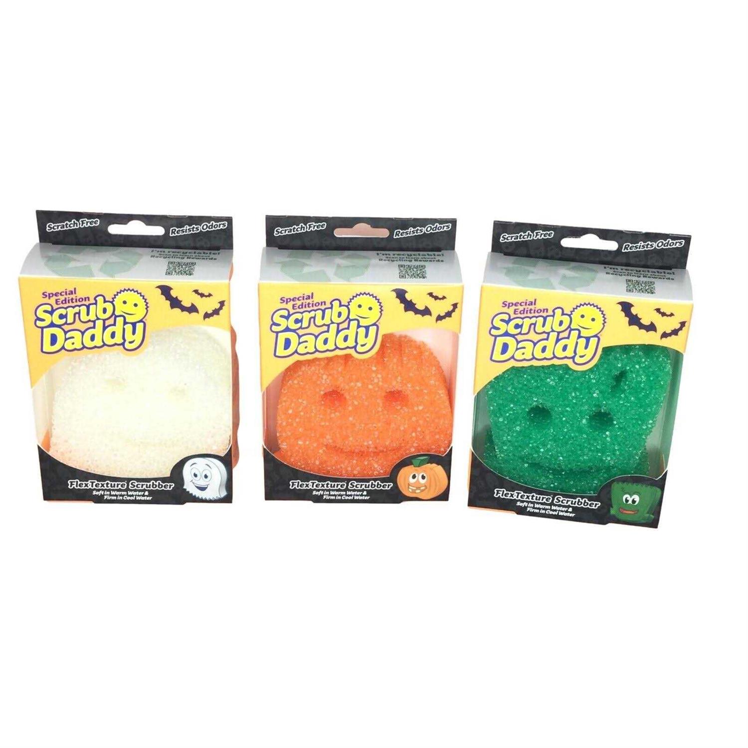 Scrub Daddy Halloween Sponges with Flex Texture are the right tool for every mess. Halloween Themed Clean. Available for a limited time. Choose from 3 spooky-shaped scrubbers. Bright orange, green, and white colors make color-coding your cleaning jobs easy. For example, assign the Frightening Frankenstein to the bathroom and the Ghoulish Ghost to pet bowls or dirty paw prints. With a design that is cute and functional, it’s hard not to smile back. His eyes hold onto you for a 360-degree reach, and his mouth cleans both sides of your utensils.