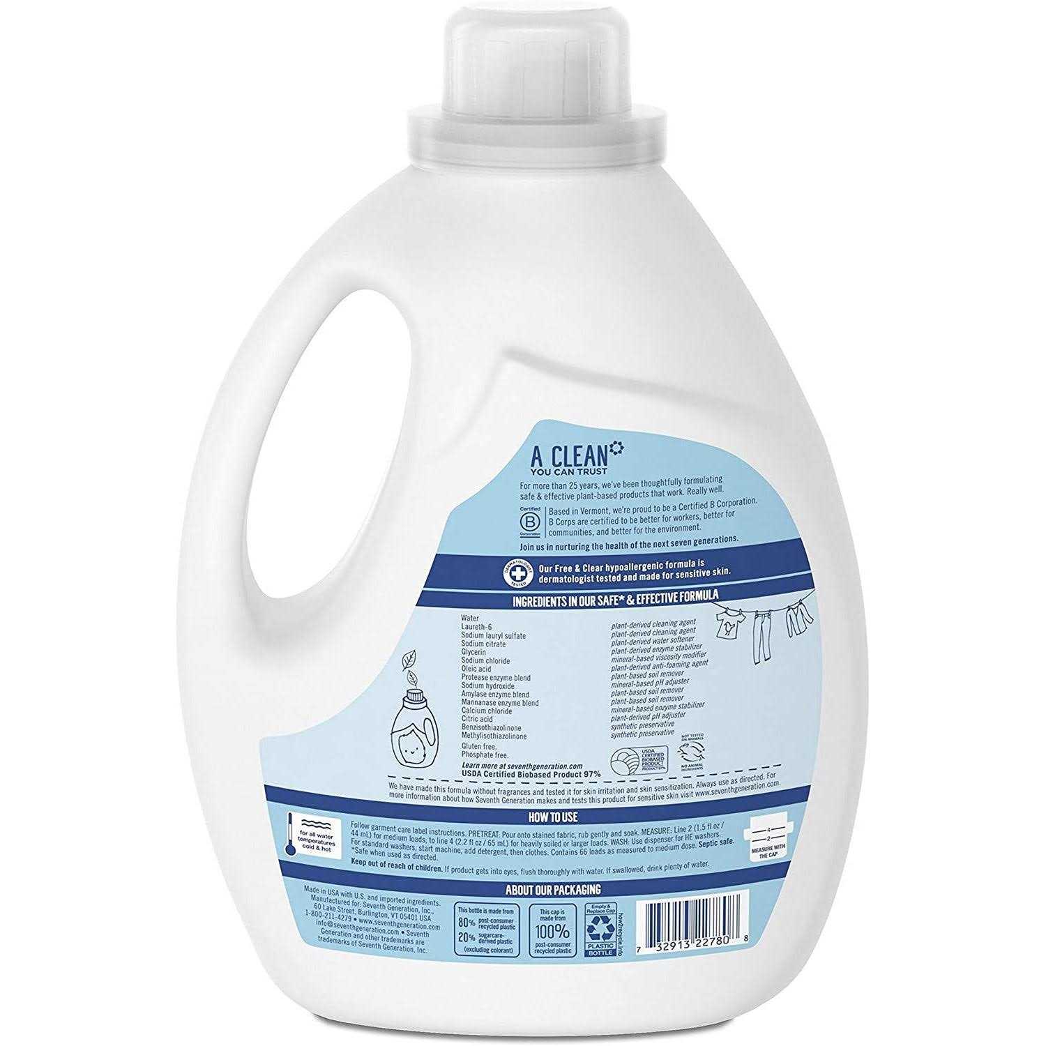 Seventh Generation Laundry Detergent is tough on stains but gentle to your world. With no dyes, artificial brighteners or fragrances, our laundry detergent liquid gives you great results in HE and standard machines and works in all water temperatures. This laundry soap is made with plant-based ingredients and is a USDA Certified Biobased 97%. Fragrance free, this liquid laundry detergent is hypoallergenic and made for sensitive skin. For more than 25 years, Seventh Generation has been thoughtfully formulating safe and effective plant-based products that work. Really well.