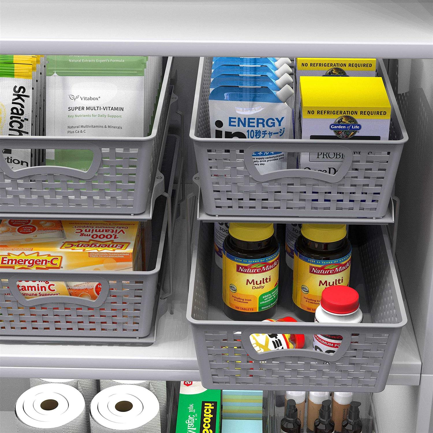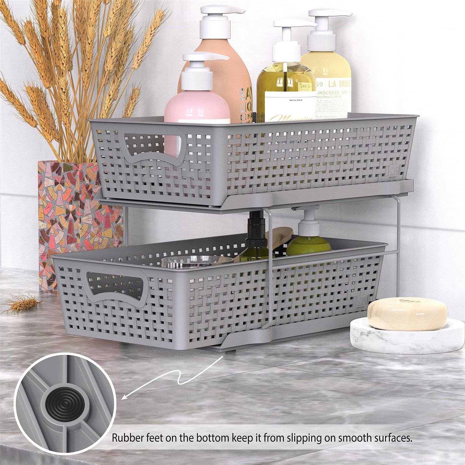 Great Bathroom Organizer Tray, Plastic Perforated Tray in Humid Places Sliding Basket for easy access in limited space ; Weaved Basket Bold Design Two drawers. Great for kitchen, bathroom and storage room organization. Gain more space in the cabinet, pantry room or even open space No drill, no power tools needed. Easy assemble and save more space Outer Dimension: 14.4″ L X 8.3″ W X 9.8″ H SimpleHouseware 2 Tier Bathroom Organizer Tray Pull-Out Sliding Drawer/Under-Sink Storage, Grey