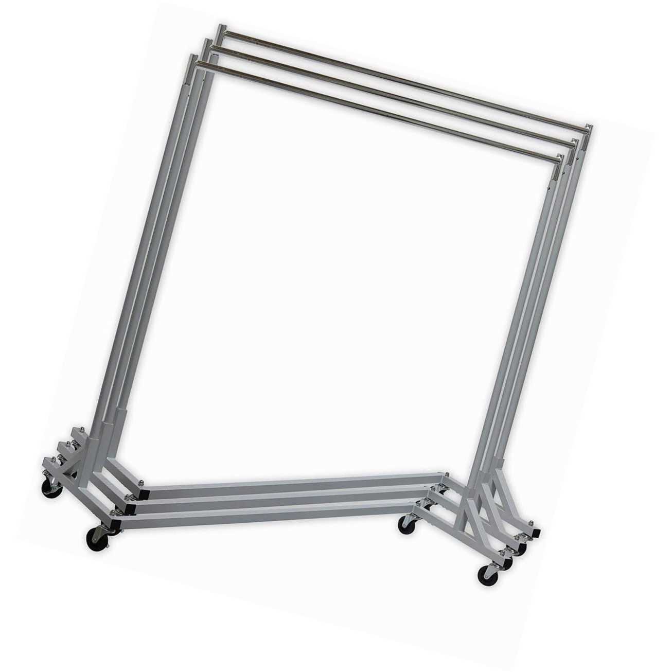 Commercial Grade Garment Rack holds up to 400 lbs (181 kgs load). Comes with Heavy duty 3″ Casters/Wheels with Brakes. Sturdy Metal construction with Classic Silver Paint. Dimensions: 63″W x 62″H x 24.2″D (160.0 cm W x 157.5 cm H x 61.5 cm D).