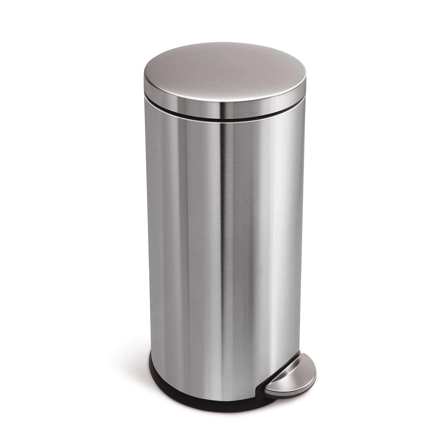 The simplehuman 30 liter classic round step garbage can is an ideal choice for just about any space. The bag tuck opening, lid shox technology and strong, all-steel pedal ensure this can will function smoothly and quietly for years. Fingerprint-proof brushed stainless steel finish resists smudges to keep the can shiny. And the non-skid base has rubber pads that are gentle on floors and keep the can steady. Try simplehuman code G liners designed to fit this can perfectly so they don’t slip and they stay completely hidden.