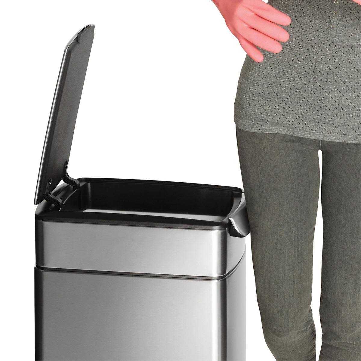 The Simplehuman Rectangular Slim Touch Bar is a slim trash can with a capacity of 40 liters. Thanks to the dimensions, this trash can can even be placed in the smallest spaces. The lid opens lengthwise and is easily opened thanks to the soft-touch system. With a simple light touch on the handle at the front, the trash can opens automatically. The hinges of the lid are on the inside, so there’s no space between the bucket and the wall. That’s convenient, because this is often just the place where dirt accumulates and is difficult to remove. The Simplehuman trash bags with code M are suitable for this trash can.