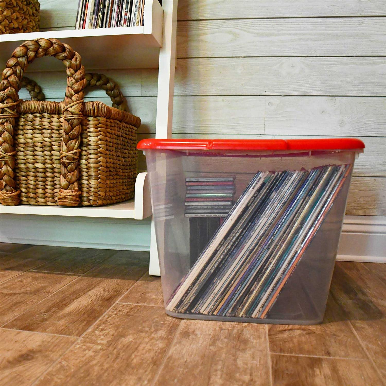 This set of four bins is great for storing holiday decorations, arts and crafts, clothes and shoes, sports equipment, and more. These versatile storage totes can be used in the garage, basement, attic, closet, or in any room that you need additional organization. Their clear design with colorful red lids complements existing decor and allows for color-coordinated storage, while the transparent sides provide visibility into the tote. These space-saving bins can be conveniently stacked with the lids on or nested together when not in use, and the snap-on lids keep items dry, dust-free, and securely stored inside. These reusable storage boxes are made with heavy duty recyclable polypropylene plastic and manufactured in the USA for a long-lasting durability you can count on year after year. Measuring 24” x 16” x 13” each, these stackable containers have a large 14.5-gallon (58-quart) capacity to maximize storage space around the home.