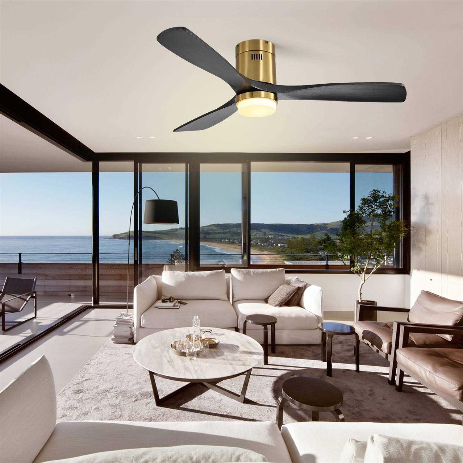 Sofucor 52 inch Flush Mount Ceiling Fan w/ Light and Remote Control, 3 Blades w/ Reverse Airflow, Brass with Matte Black