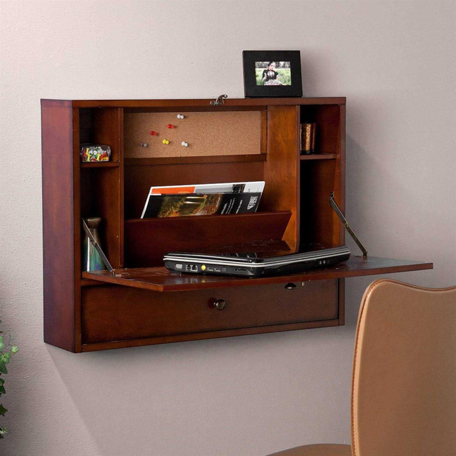 Completely folds away to save space. Drawer measures 24″ W x 5″ D x 3.25″ H. Overall dimensions: 26″ W x 6″ D x 20″ H. A space-efficient design with a contemporary flair is what best describes the Wall-Mount Laptop Desk – Brown Mahogany. A neat and compact solution fitting any room, it’s a child-friendly and highly functional desk. A foldable desk conceals shelves where essentials can be stored. It has an engineered wood construction and a brown mahogany finish for visual appeal. A durable combination of MDF with wood veneer and metal hardware, it mounts easily and complements most décor styles.