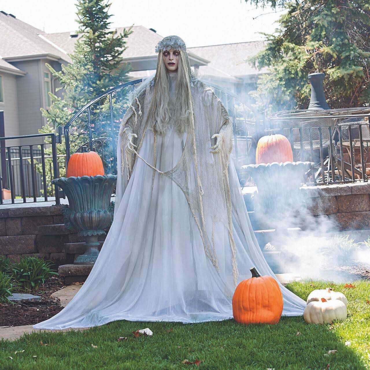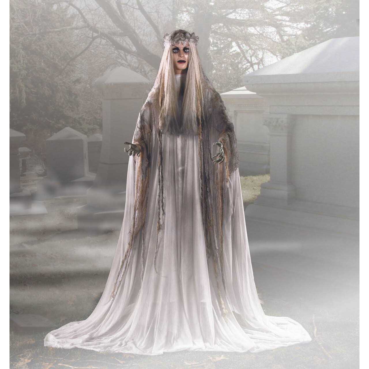 Hauntingly beautiful, this standing ghost is a vision of Halloweens long gone by. Is she a jilted bride or an eerie reminder of fading beauty? This creepy Halloween decoration is the perfect way to haunt your house for a holiday party and will make fright night a real scream for trick-or-treaters. The standing ghost girl has plastic features, flashing red eyes, and wears a flowing polyester gown with a tattered creepy cloth headdress and long veil. Includes a plastic stand with a telescoping metal support pole.