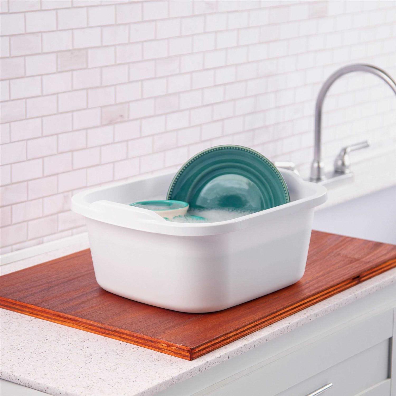 The new dishpan from Sterilite features improved durability with an updated handle area and a more robust rim and base. The new style of this plastic dishpan offers a superior functional solution for day-to-day use throughout the home and fits into almost any kitchen or utility sink. Sterilite dishpan boasts an improved strength of the new design ensures consumers can confidently transport a full dishpan without concern. Ridges in the bottom of the white dishpan allow dirt and debris to settle in the bottom and not be churned up, keeping dishes or laundry cleaner. Besides, this plastic dishpan made of heavy-duty plastic has no sharp corners or crevasses. Sterilite dishpan fits easily inside any standard single or double sink. The sturdy handles integrated into the rim make this easy-to-clean dishpan easily portable. It is designed to better transport when filled with water. Use this Sterilite dishpan that is ideal for all household tasks such as soaking dishes or laundry.