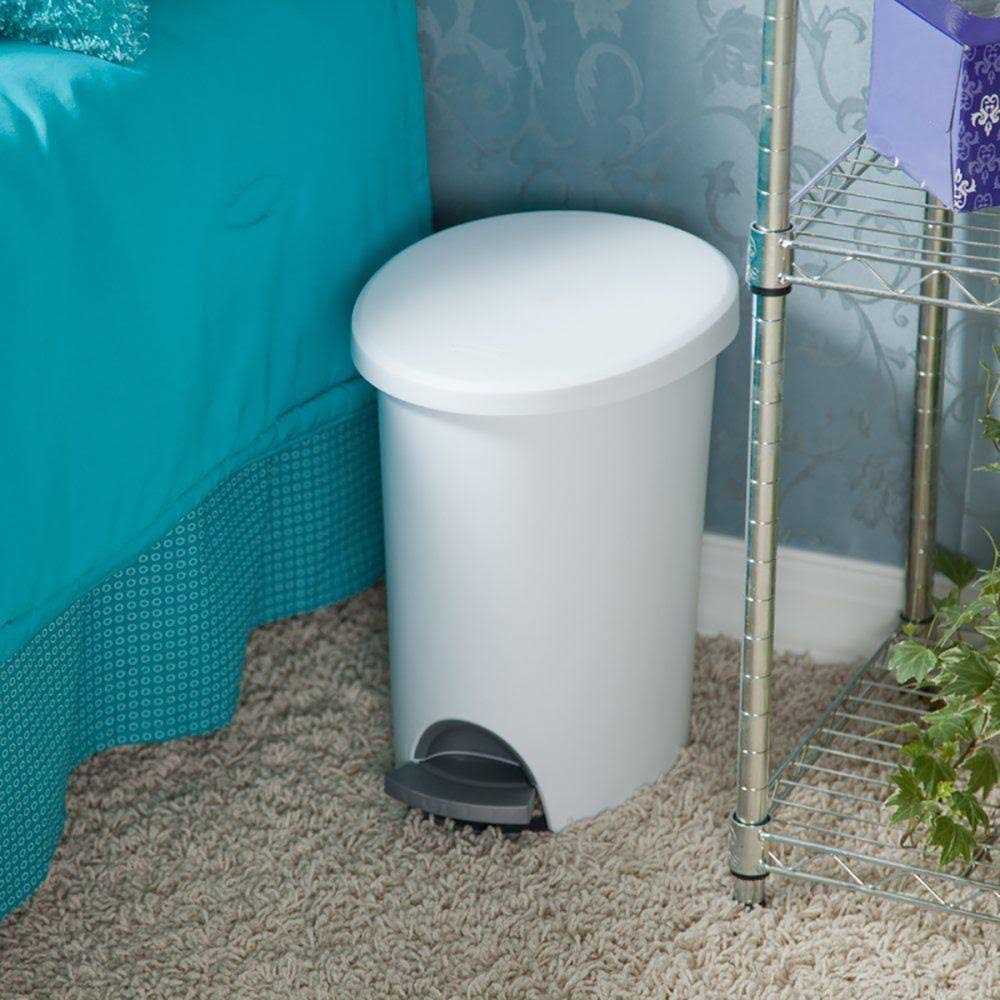 The Sterilite 2.6 Gallon Ultra StepOn Wastebasket provides convenient, step-on access for hands-free opening while hiding contents from sight. The slim, oval design makes this wastebasket ideal for use in narrow spaces within the bathroom, bedroom or home office and the lid helps contain odors. The removable liner includes a bag holding feature that helps keep a standard plastic shopping bag or 4-gallon trash liner in place when the wastebasket is in use. This Wastebasket has a smooth textured surface that is easy to clean. The overall dimensions of this item are 11.5 inch L x 9.25 inch W x 13.125 inch H.