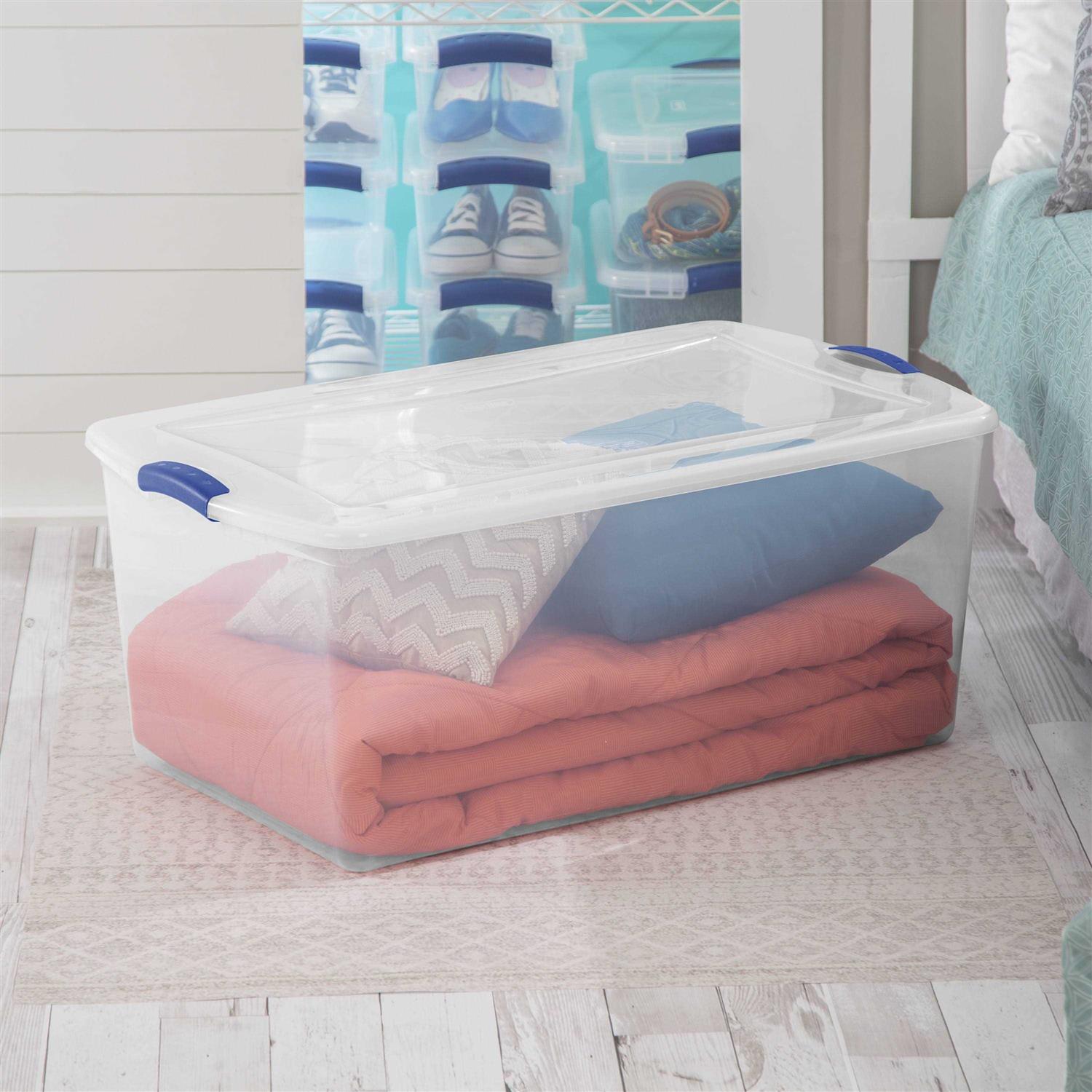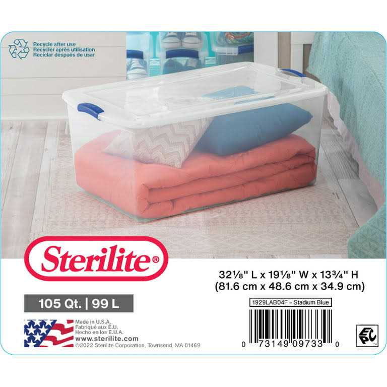 The Sterilite 105-qt Latch Box Stadium Blue, Single is an ideal storage solution for larger items or to store multiple items in one place. Secure latches keep the lid attached to the base so that items are kept safely inside yet are still easy to get to when they are needed. The clear base and lid of the Sterilite storage box allow contents to be easily identified from any angle, which is a tremendous help during organization. If you are working with multiple of these boxes, they are able to stack neatly on top of each other to save space. This Sterilite Latch Box is ideal for storing bedding, camping, sporting equipment and other bulky items. It has a contemporary style and shape. The colorful latches will allow you to have a color-coded system or just add a little bit of color to any space.