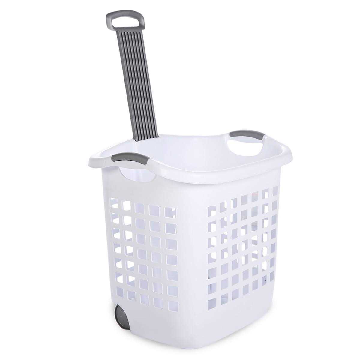 The 1.75 Bu. / 62 Liter Ultra Wheeled Laundry Basket is the best combination of basket and hamper. It combines the valued features of portability and capacity. It offers smooth gliding wheels and a retractable handle that pulls up to easily transport clothes to and from the laundry room or bedroom. The hole pattern allows clothes to remain well ventilated and integrated handles allow for easy carrying up and down stairs. Color: White.