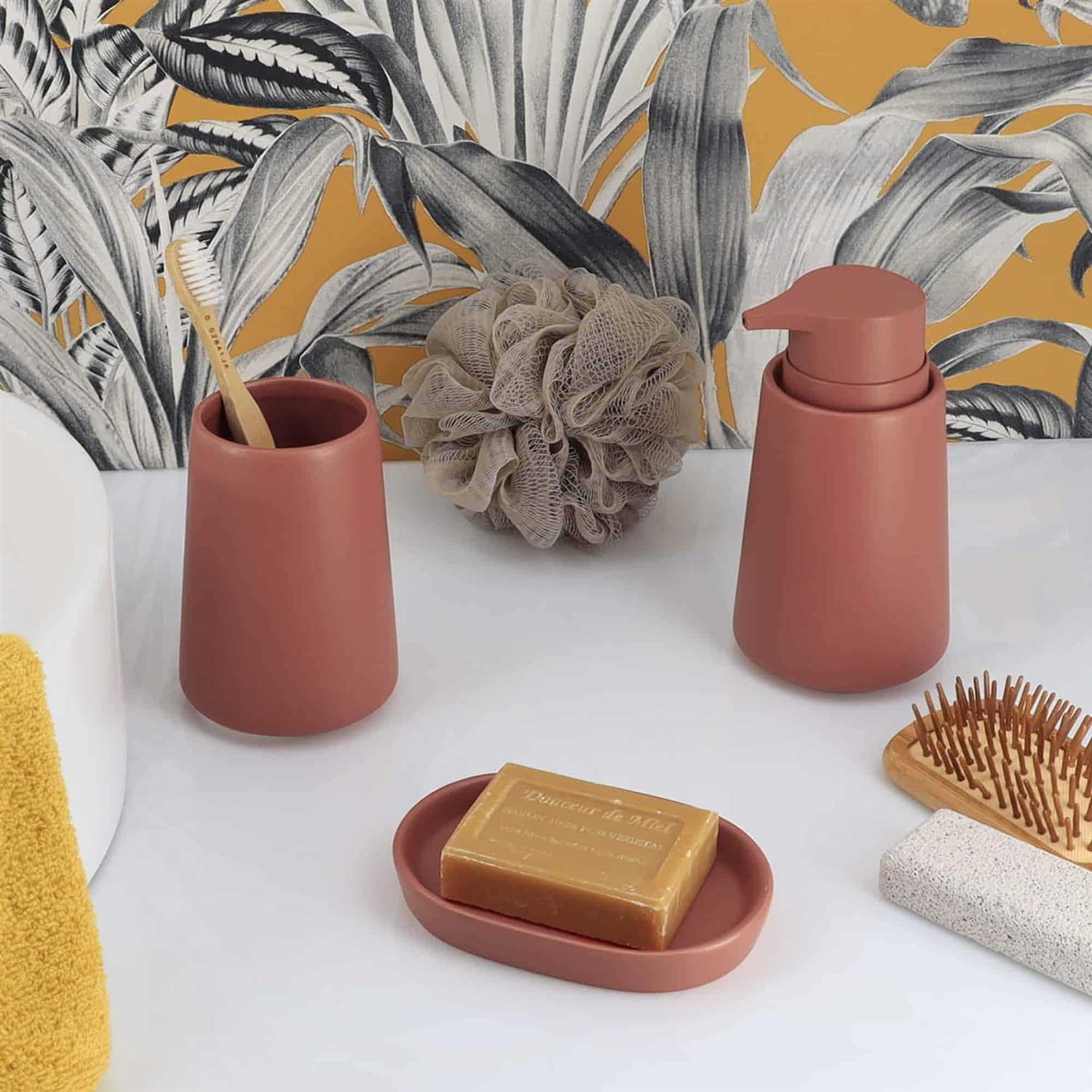 Our Terracotta Stoneware Soap Dispenser is perfect for adding a touch of warmth to your bathroom or kitchen. With a flared shape and a 14 fl oz capacity, it is perfect for holding your favorite lotion or soap. Made of high-quality stoneware, this dispenser is durable and easy to clean. Its smooth and basic design is perfect for any decor, and you can use it in any room of the house. Its versatile use makes it a perfect addition to any modern or classic bathroom decor. It is part of a collection that includes a soap dish, tumbler, and toilet brush holder. Its unique and warm design adds a touch of coziness to any bathroom or kitchen decor.
