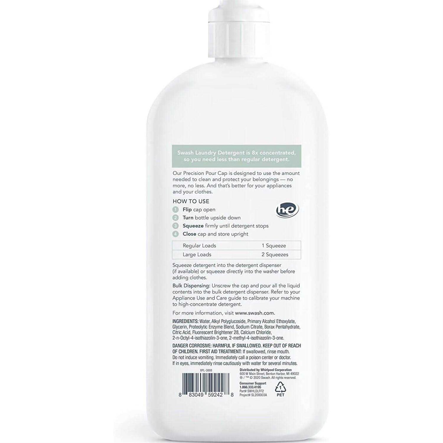 Introducing Swash detergent from Whirlpool Corporation — a detergent designed to care for your belongings by using only what you need — no more, no less. And with zero phosphates and 8x concentration, you need less than regular detergents. Swash is The Smart Way to Wash. Swash promises to care for, not just clean, your clothes. To do more while using less. And to precisely design the best detergents for both your machine and your lifestyle by applying over 100 years of our company’s laundry experience. Free & Clear contains no fragrance or dyes. Swash works in both HE and non-HE washers. Use one squeeze for regular loads, and two squeezes for large loads.