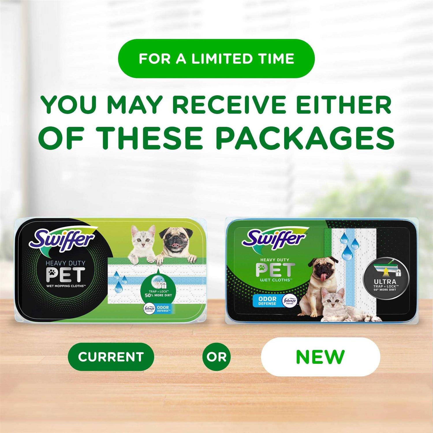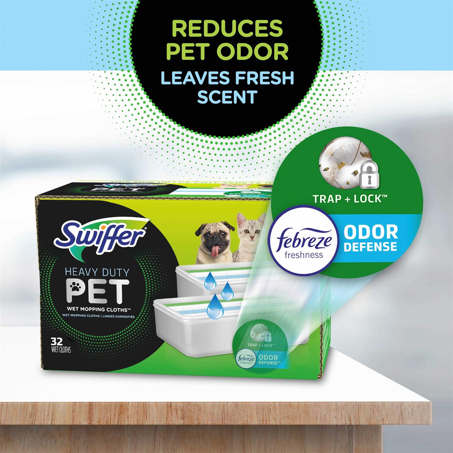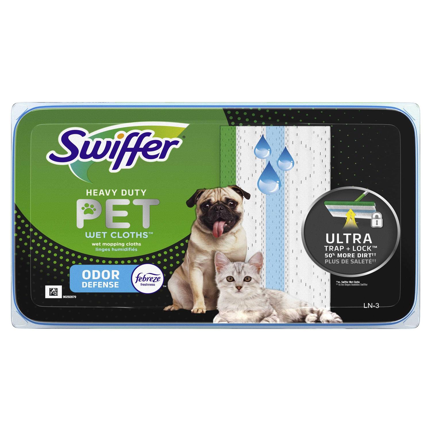 Swiffer Sweeper Pet Heavy Duty Wet Mopping Pad refills with Febreze Freshness Trap + Lock 50% more Pet Mess allowing you to quickly and easily clean all your hard floor surfaces. The Dirt magnet Strip funnels dirt & liquids into the pad’s center and off your floors. The Scrubbing strip breaks apart even the most stubborn dirt. Safe on all finished floors. Make sure to try Swiffer Heavy Duty Dry Cloths to take your sweeping game to the next level. Tracked-In Dirt vs. Multi-Surface Sweeper Wet Mopping Cloths.