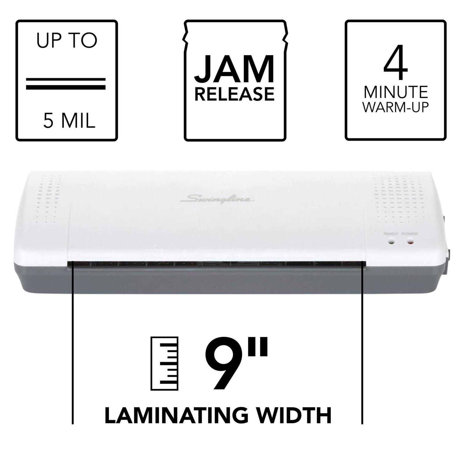 PERSONAL USE Both compact and stylish, this white and gray laminator is perfect for any home, school or small office. Its great for photos, handouts or any creative laminating needs. SIMPLE START UP Get started on projects right away. The laminator warms up in as little as 4 minutes for quick and easy use, and has a convenient ready indicator light. Laminate at 98243 per minute. QUALITY RESULTS The 98243 document width allows for a variety of projects, while smooth rollers help items stay wrinkle-free. Compatible with any 3 and 5 mil laminating pouches.