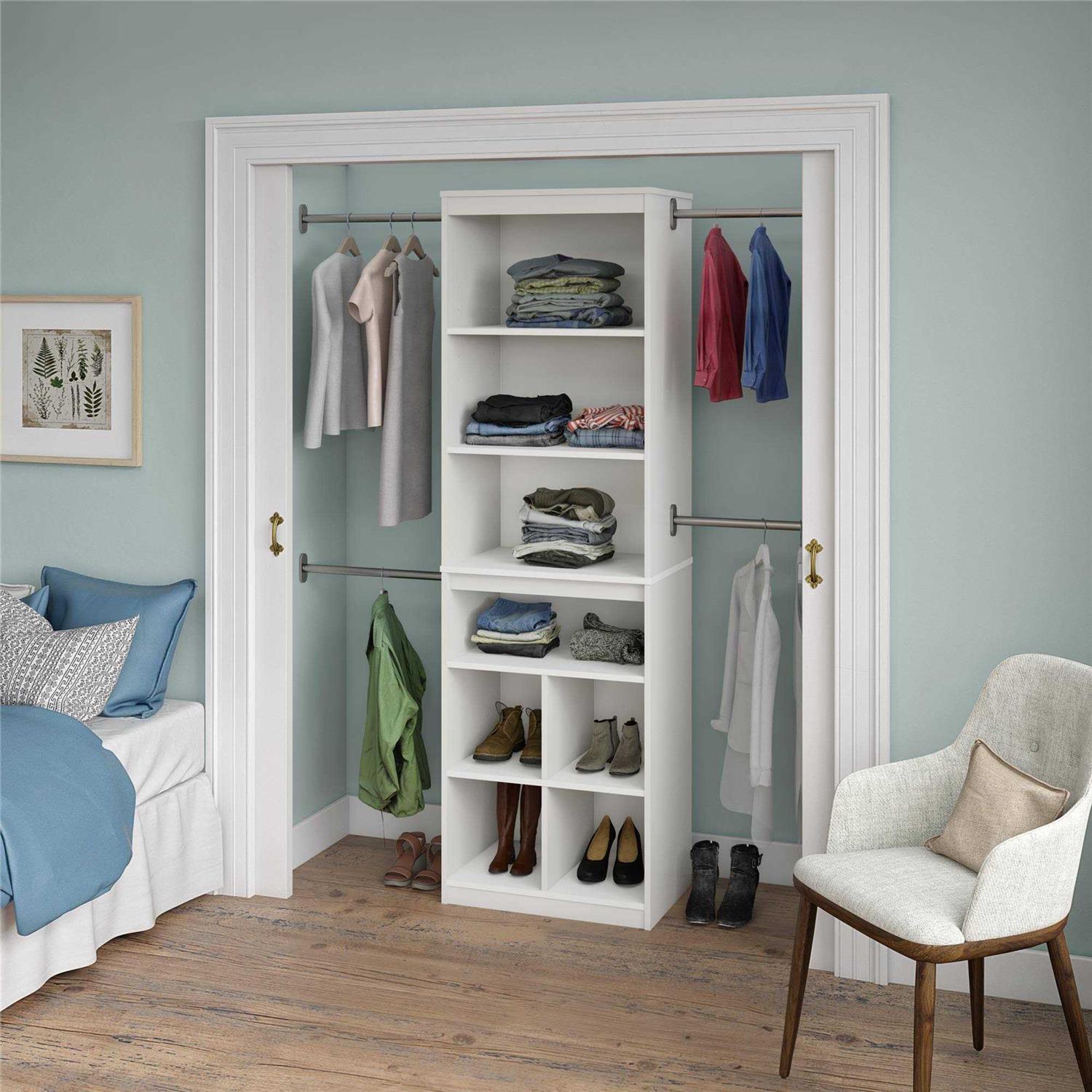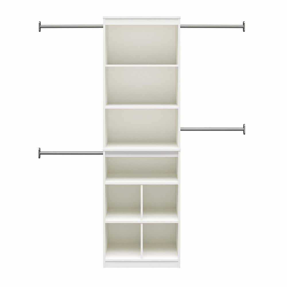 Give yourself the gift of organization in your closet with the SystemBuild Rochon Closet Storage System. Made of laminated particleboard the clean white finish will seamlessly blend in with your existing decor. The simple yet sleek look of this system brings just enough storage with 4 adjustable clothing rods 4 shelves 1 adjustable and 4 shoe cubbies. The clothing rods can adjust from 21 to 36 and can be assembled anywhere on the outside of the closet system with the pre-drilled holes on the side panels. A wall anchor safety bracket is included to provide additional support for this unit. Each clothing rod supports a maximum weight of 50 lbs. The 4 center shelves each support a maximum weight of 40 lbs. while the shoe cubbies hold up to 20 lbs. eac. SystemBuild warrants this product to be free from defects and agrees to remedy any such defect. With over 30 years’ experience in RTA furniture Ameriwood Home and SystemBuild offer a wide range of home furniture products for every room of the house. Acquired by Dorel Industries in 1978 Ameriwood Home and SystemBuild have become a leader of RTA furniture growing in Bedroom Home Office Entertainment Storage and Youth products.