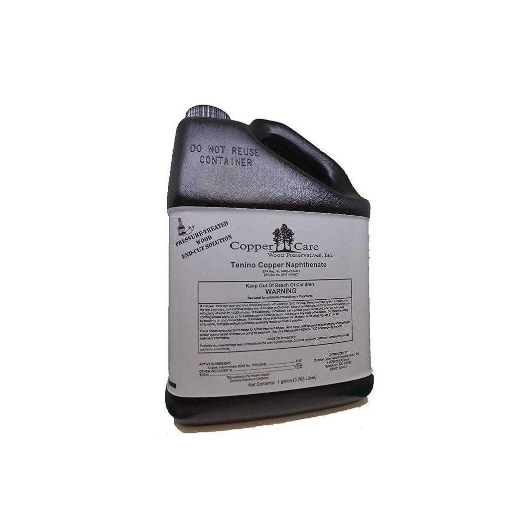 Tenino Copper Naphthenate EPA Reg. No. 64405-22-54471 Always read and follow all label directions. For Exterior Use Only! Tenino Copper Naphthenate contains 2% copper as metal as an oil-borne solution, labeled for General Use. This ready-to-use solution in sturdy one gallon resealable jug provides coverage of 100 – 300sq ft., requires no mixing or dilution and may be applied by brush to almost any wood product needing protected from the elements. Treated wood will be protected from infestation of destroying organisms including subterranean termites, drywood termites, wood destroying beetles, powderpost beetles, carpenter ants and decay fungi. It may also be used to protect and prevent warping, swelling, shrinking, and end checking caused by changes in moisture content of wood products, rot, mold, mildew and moss. Tenino can be used for remedial or preventive treatment of standing wooden poles, piling and other existing structures wooden and cellulose utility and construction products including: lumber end cuts timber rail ties posts poles freeway fencing siding boats piers docks boxes roofs shakes cedar shake roofs shingles porches steps fences rails beverage cases Tenino treated wood is suitable for ornamental or planting landscape timbers, ties, wooden seedling trays, outdoor decor, flower boxes and window boxes. Tenino meets the AWPA Standard M4 end-cut requirements for exterior and ground contact field treatments and should be used to fulfill requirements in IBC 2303.1.9, and IRC R317.1.1 whenever pressure treated lumber is cut, or drilled. Tenino is best used to supplement pressure-treated preservative wood protection in aggressive hazard class environments envisioned in AWPA Use Category 4,4B,4C.