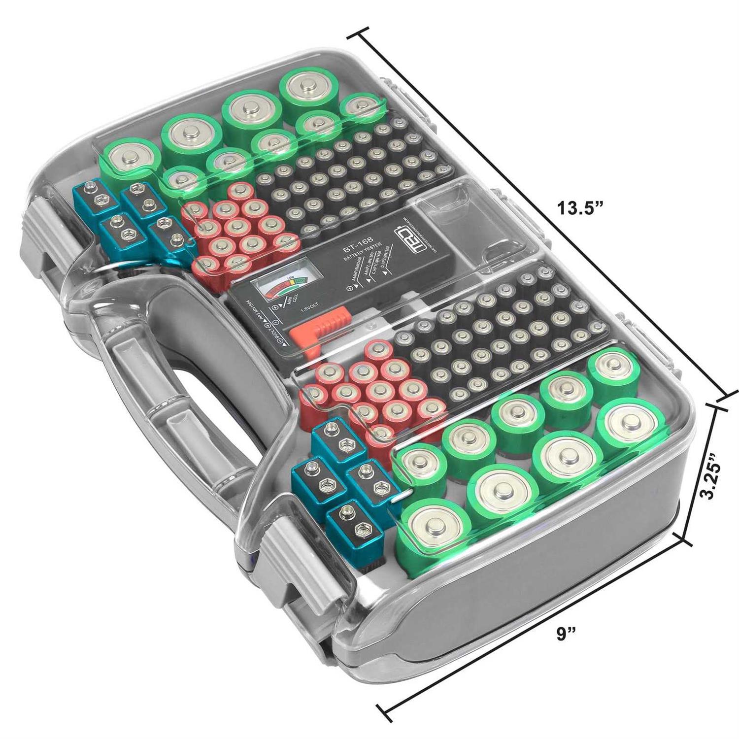 Great item to eliminate your cluttered drawers and closets. Helps keep your batteries neat and organized! also includes a battery tester that you can easily remove. The tester doesn’t require any batteries for operation. It works on the power of the battery you are testing! you can store it conveniently in your drawer, closet or you can mount it on the wall. Stores up to 180 batteries (not included): 78 AA batteries, 64 AAA batteries, eight 9V batteries, 10 C batteries, eight D batteries, and 12 flat batteries.