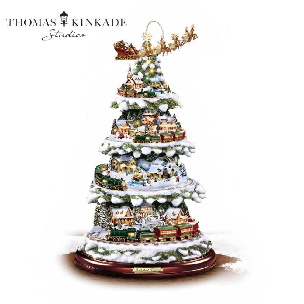 As Santa and his reindeer joyously fly into the Christmas night, the Wonderland Express slowly chugs its way round and round the peaceful little village nestled amongst snow-kissed evergreen boughs. Now, you can capture the joy of this wondrous night in your home with an exclusive Collectibles Market First Thomas Kinkade musical animated tabletop Christmas tree with moving trains. It showcases four levels of rotating movement – including Santa and his sleigh – you’ll watch as the train “climbs” ever higher up the tree and notice 12 brilliantly illuminated buildings and over 2 dozen handcrafted figures.All aboard for the merriest Christmas ever with this enchanting collectible Christmas home decor, available exclusively from Hawthorne Village. Inspired by the Painter of Light’s&153; beloved artwork, this handcrafted and hand-painted Thomas Kinkade animated tabletop Christmas tree plays a medley of 8 beloved Christmas carols. Fully sculptural and intricately detailed, the holiday scenes
