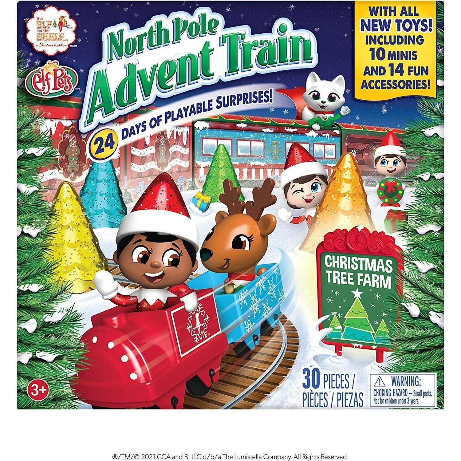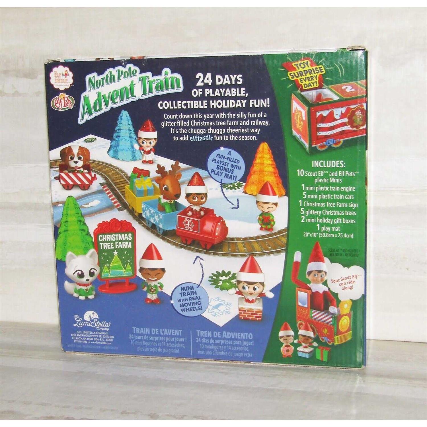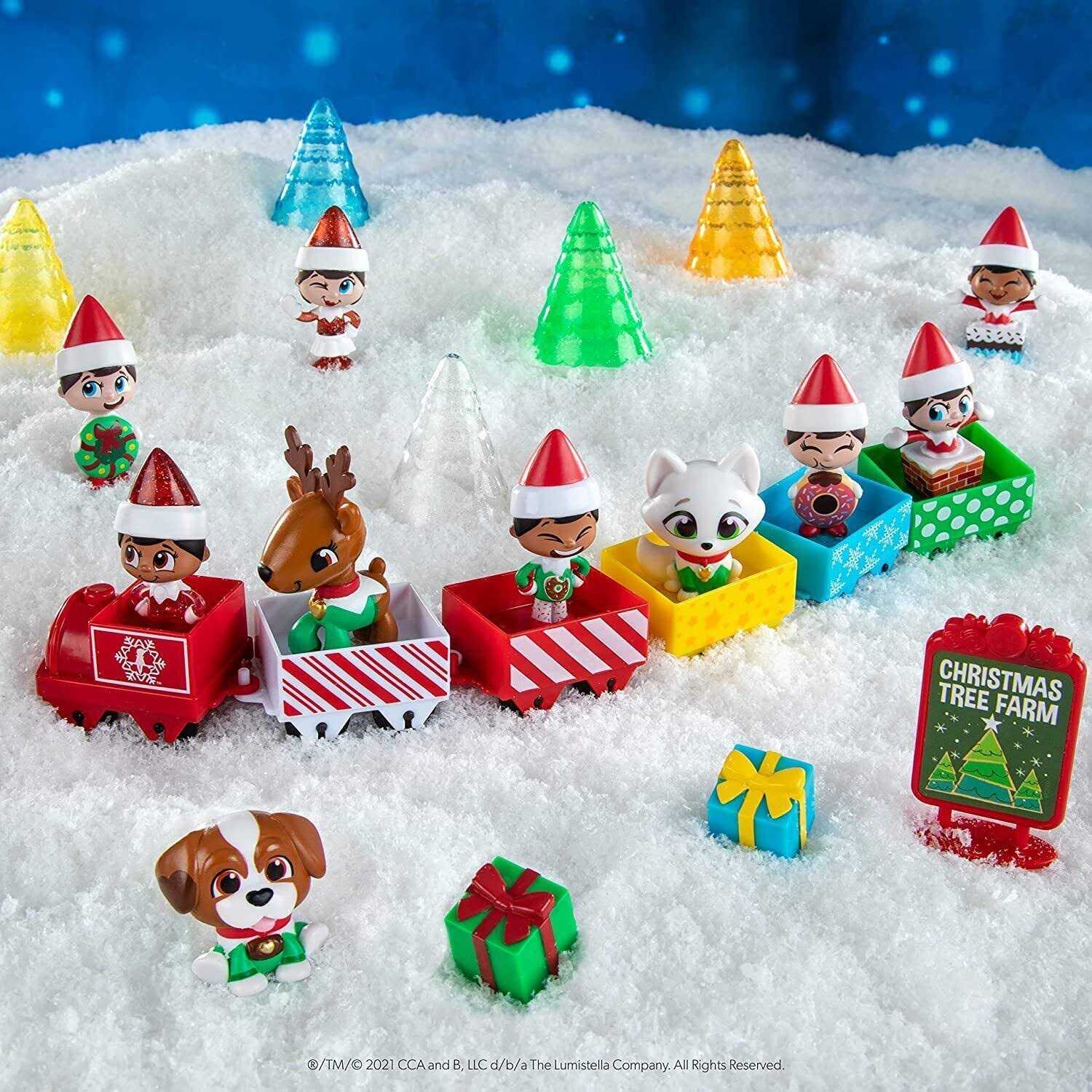 Includes 24 Days of Christmas Tree Farm themed surprises! 10 Elf and Elf Pet Minis 1 mini plastic train engine 5 mini plastic train cars And so much more! Count down to Christmas with a train-shaped Advent calendar filled with daily surprises that create a colorful, playable Christmas tree farm and railway. Its the chugga-chugga cheeriest way to add playtime fun to the season!