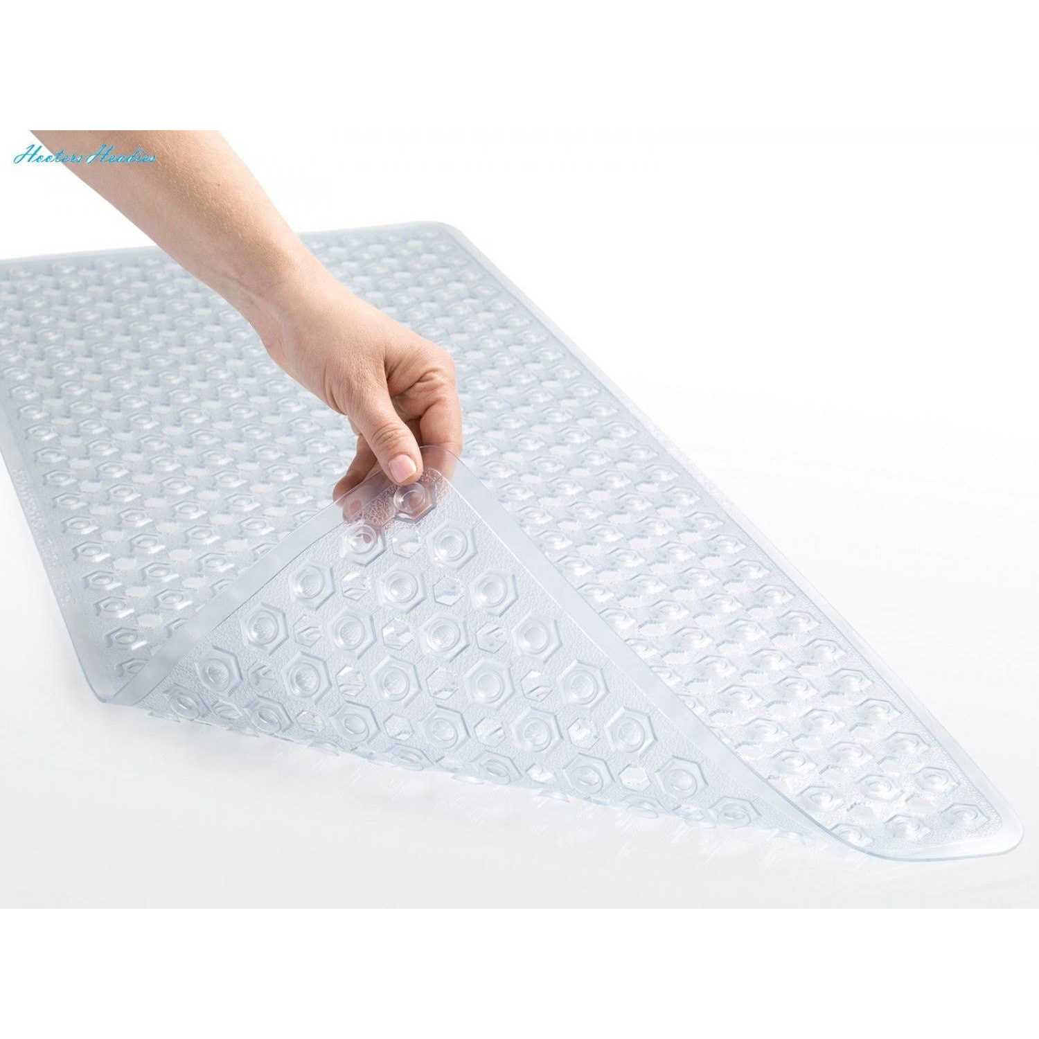 PATENTED DESIGN WITH POWERFUL SUCTION GRIP: a bathmat designed to securely stay in place; the patented mat features hundreds of suction cups that effectively help secure the mat to your tub or shower floor EASY WATER DRAINAGE: hundreds of drainage holes allow for water to easily flow under the mat and towards the drain, helping to prevent water from sitting stagnant under the mat in your tub TEXTURED AND BPA-FREE: the mat is constructed from BPA free materials; it features a unique hexagon design with a pebble textured topside that is soft on feet; bathmat is soft, flexible, and perfect for the whole family OVERSIZED AND MACHINE WASHABLE: the bathmat is so easy to clean, simply machine wash and air dry; you can easily air dry the bathmat by hanging it over the side of the tub; generously sized mat measures 35 by 16 inches; much larger and longer than others, providing excellent coverage FOR ALL TUBS: bathmat fits all kinds of tubs and inserts; only install on smooth, clean, non textured and non tiled surfaces; not for use on newly refinished tubs, shower pans, or similar surfaces COMMONLY ASKED QUESTIONS CAN I USE THIS ON MY TILED OR TEXTURED TUB/FLOOR? Unfortunately, No. To Prevent Falls: Secure suction cups before each use. Mat will only attach to clean, smooth surface. Not for use on textured, tiled, or non-smooth surfaces. Do not use bath oils – may cause slipping. MY LAST BATH MAT TURNED YELLOW? Do you have well water? Iron in well water can occasionally turn bath mats yellow. Otherwise, your mat should remain exactly like the color you purchased it. CAN I REALLY PUT THIS IN THE WASHING MACHINE? Yes, you can. Simply throw in your washing machine on cold with gentle detergent (no bleach). Air dry.