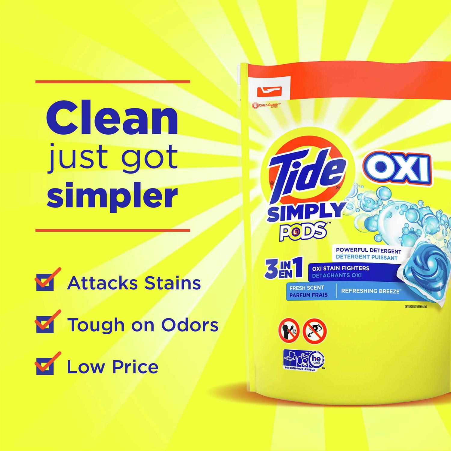 Clean just got simpler as your favourite Tide Simply Clean & Fresh is now available in laundry pacs. Tide Simply Clean & Fresh PODS provides the right clean at just the right price. With 3x the power of baking soda liquid detergent*, these laundry detergent pacs dissolve in any temperature. They can be used in front and top loading washing machines, both standard and high efficiency.
