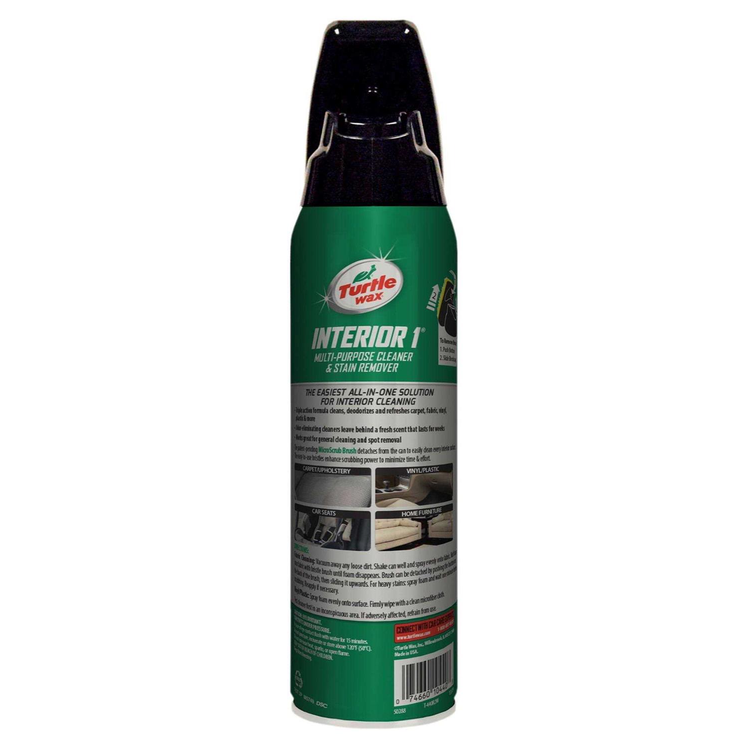 This all-purpose car stain remover features a triple-action formula to remove light soils and residues from interior surfaces. With its patented, detachable, ergonomic brush, Interior 1 easily deep cleans carpet, upholstery, car seats and tough, hard-to-reach spaces inside your car with a powerful foam cleanser. Plus, as you’re scrubbing, this car carpet cleaner also deodorizes unpleasant odors from coffee stains, food spills, pets and other common contaminants. Interior cleaning is now simpler than ever!