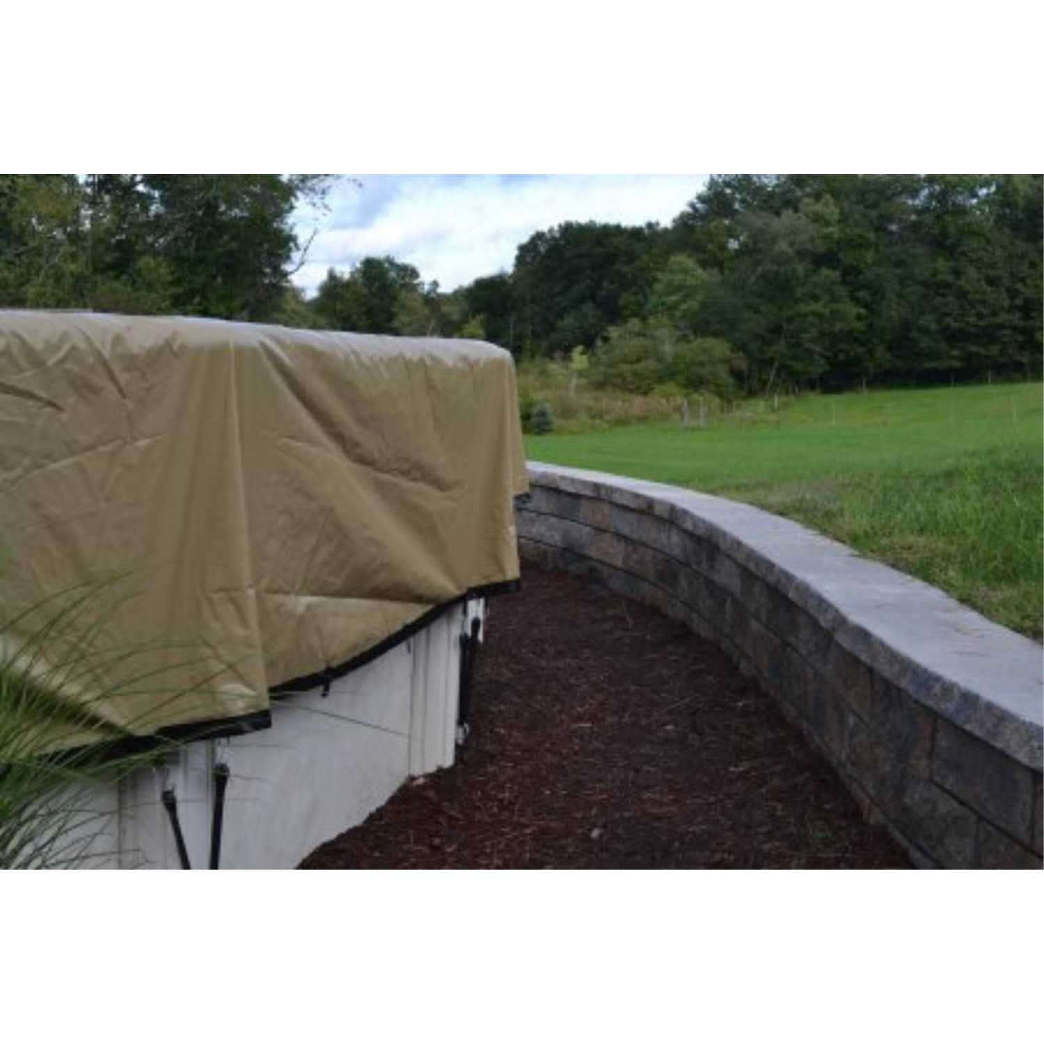 Introducing the Revolutionary new cover for above ground swimming pools. The Ultimate Solid Cover is manufactured using incredibly strong, poly-weave materials with a high tear and puncture resistance. Six inch drain panel, North American made of patented, high-tech mesh material sewn as a band across the center of the cover, allows rain and melted snow to pass through. Debris and leaves remain on top of the cover and can simply blown or brushed away. NO MORE messy cleanup for Spring opening. Constructed of attractive tan material these covers have fabric loops to secure and reinforce perimeter binding to enhance the unique characteristics of the Ultimate Cover. Includes protective liner guards and high-quality, UV stabilized securing straps. When opening your swimming pool next year, simply release the securing cords, vacuum your pool and you are ready to swim and enjoy! The Ultimate cover is truly the smart choice! Full coverage on manufacturer defects only.