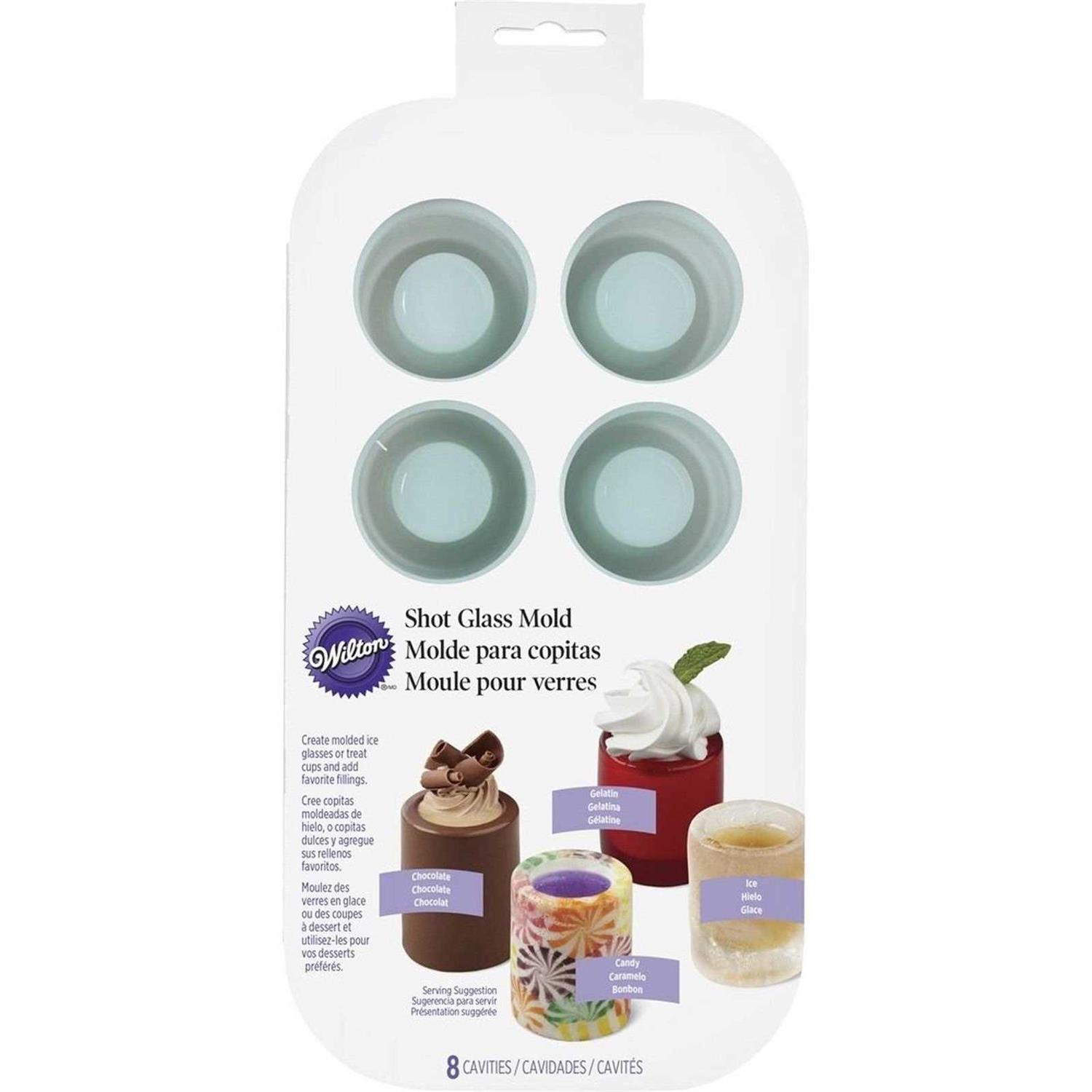 One Wilton 8 Cavity Silicone Shot Glass Mold Make your own edible shot glass from ice, candy melt candy, gelatine, crisped rice cereal treats and more. You can then add your favourite filling & beverage. These perfectly shaped shot glasses are a unique way to pump up an ordinary drink. The possibilities are endless. Clean-up is a breeze, because party guests can eat the containers. Always place mould on level baking sheet for easy positioning and removal from oven, refrigerator or freezer. When baking, for best results, spray baking surface with non-stick spray. The Wilton 8 Cavity Silicone Shot Glass Mold is heat resistant to 260 degrees Celsius and can also withstand changes to temperature, such as moving from freezer directly to oven. The round shot glass mold features one design and eight cavities.