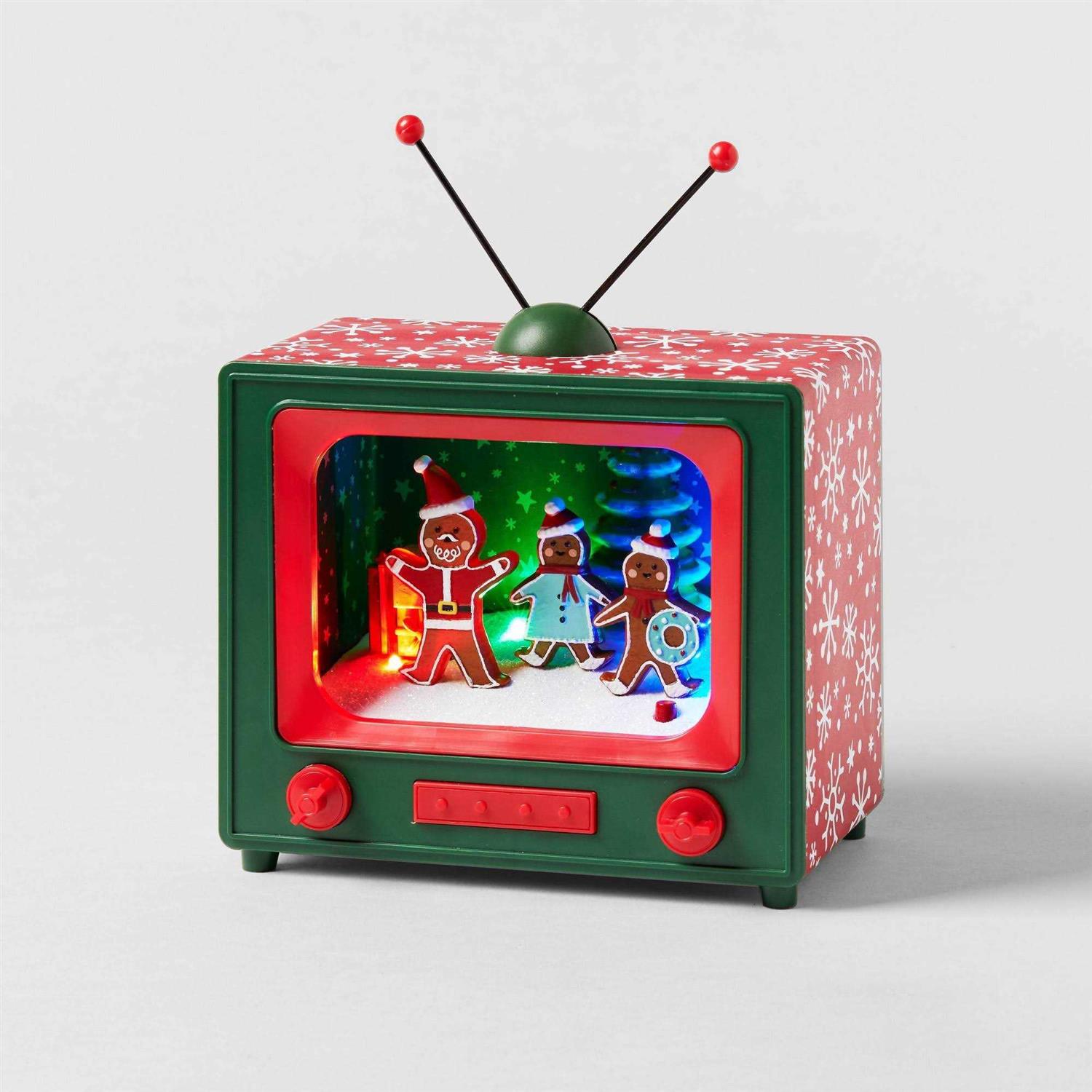 Add some nostalgia to your holiday decor with the Animated Gingerbread Friends Retro Television Christmas Decorative Prop from Wondershop . This battery-operated decorative prop features gingerbread people and a decorated Christmas tree inside a vintage television, complete with dials and an antenna. It’s attached to a weighted red base with a snowflake pattern. Great for displaying on a mantel, desk, coffee table or console table, this festive TV prop fills with faux snow and plays the tunes “Deck the Halls,” “Joy to the World” and “Twelve Days of Christmas.” Welcome to the Wondershop .